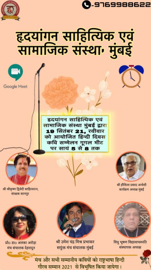 अखिल भारतीय सुप्रसिद्ध संस्था हृदयांगन मुंबई आगामी रविवार 19 सितंबर 2021 को आयोजित कर रहा है आन लाइन राष्ट्रीय कवि सम्मेलन। हृदयांगन प्रमुख डॉ विधु भूषण त्रिवेदी जी के स्नेहासिक्त आशीष की छत्रछात्रा में सभी सम्मानित कवियों का संगम ।