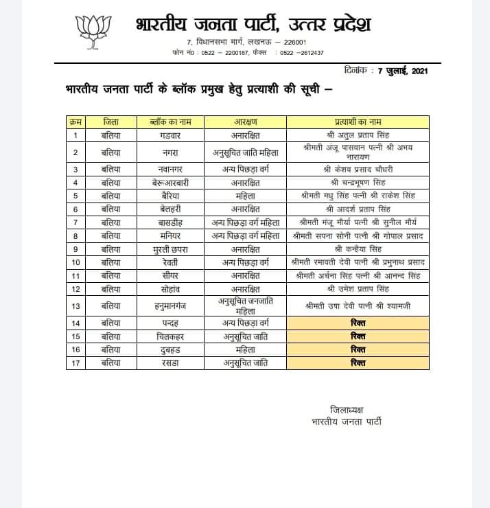 बलिया के 17 ब्लाक में भाजपा ने 13 पर उम्मीदवारों का किया घोषणा, सीयर से अर्चना सिंह को टिकट
