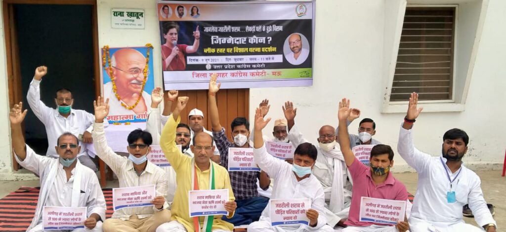 मऊ।जिला व शहर कांग्रेस कमेटी के तत्वाधान में प्रदेश में नकली शराब से हो रही बे हताशा मृत्यु पर वर्चुअल मीटिंग कर प्रदर्शन किया गया प्रदर्शन में वक्ताओं ने कहा कि भारतीय जनता पार्टी की सरकार अपने नेताओं को नियमों से हटकर लाइसेंस देती है जिससे वह नकली शराब बना कर के उसका मुनाफ कमाते हैं और उस नकली शराब की वजह से देश की तमाम जनता मर रही है