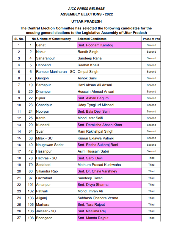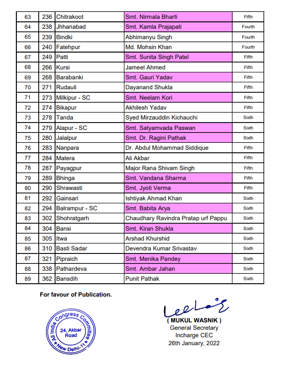 कांग्रेस ने उत्तर प्रदेश विधानसभा चुनाव के लिए 89 उम्मीदवारों की तीसरी सूची जारी की