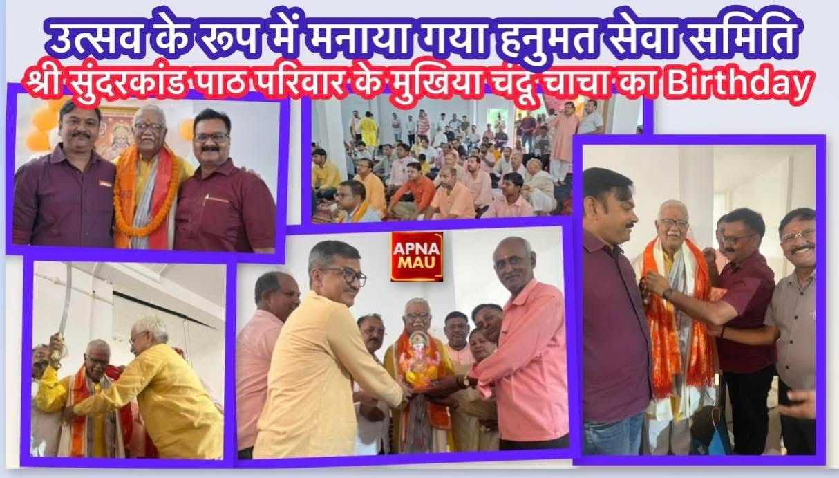 मऊ। उत्सव के रूप में मनाया गया हनुमत सेवा समिति श्री सुंदरकांड पाठ परिवार के मुखिया चंद्रशेखर अग्रवाल उर्फ चंदू चाचा का 77वां जन्मदिवस। इस अवसर पर संगीतमय श्री सुंदरकांड पाठ, भजन, व केक काटकर मनाया गया। यह आयोजन समिति में जुड़े नए सदस्य अनमोल राय के द्वारा रविवार की सुबह तजोपुर इंडस्ट्रियल संस्थान में आयोजित किया गया था। समिति के लगभग 300 लोगों की उपस्थिति में धूमधाम से चाचा जी का जन्मदिन मनाया गया