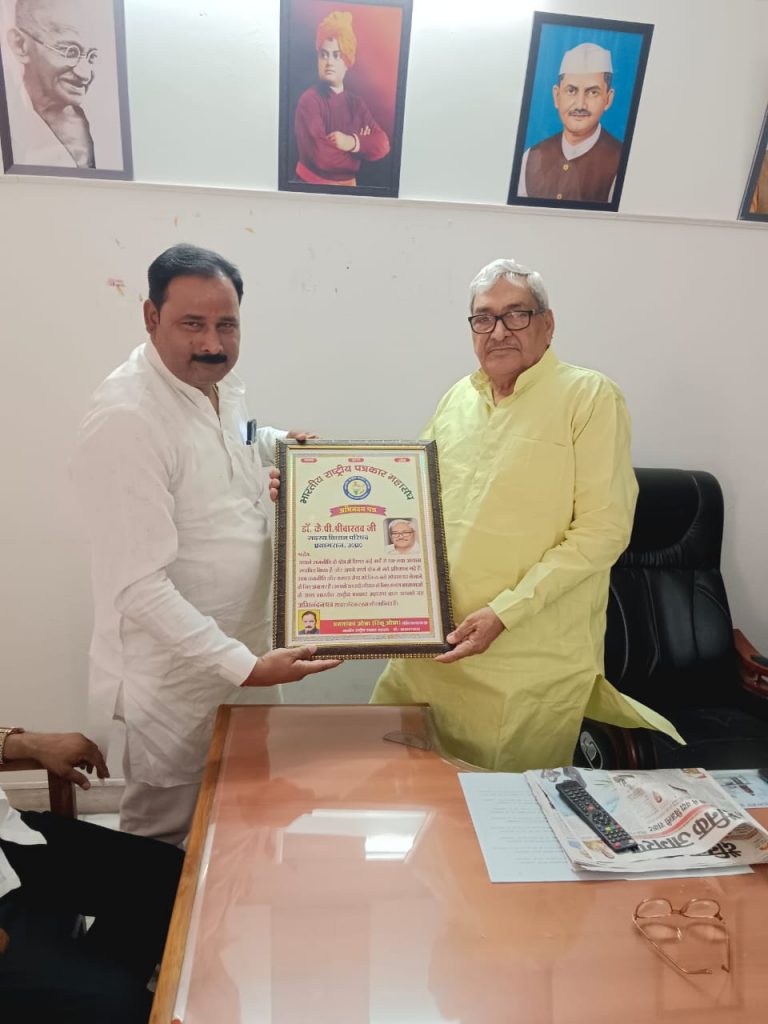 प्रयागराज। भारतीय राष्ट्रीय पत्रकार महासंघ की उत्तर प्रदेश इकाई का एक प्रतिनिधिमंडल उत्तर प्रदेश के प्रांतीय अध्यक्ष प्रभा शंकर ओझा के नेतृत्व में नवनिर्वाचित विधान परिषद सदस्य डॉक्टर के पी श्रीवास्तव से मिला और उन्हें संगठन की ओर से स्मृति चिन्ह एवं अभिनंदन पत्र भेंट किया गया। प्रतिनिधि मंडल की ओर से विधान परिषद सदस्य से आग्रह किया गया कि वे प्रदेश के पत्रकारों की समस्याओं को सदन में उठाएं और पत्रकारों की आवाज बनकर उनके लिए कल्याण के लिए सरकार से योजनाएं क्रियान्वित करने की पहल करें। भारतीय राष्ट्रीय पत्रकार महासंघ उत्तर प्रदेश के प्रांतीय अध्यक्ष प्रभा शंकर ओझा के नेतृत्व में रूद्र मणि द्विवेदी, हौसला प्रसाद सिंह पटेल, प्रतीक शुक्ला, अशोक कुमार पटेल, नागेश शुक्ला और शिवजी मिश्र गाना महाराज के साथ अन्य पत्रकार साथी उपस्थित रहे। जिन्होंने डा० श्रीवास्तव को उनके विजय के लिए हार्दिक बधाई दी और उनके यशस्वी जीवन की मंगल कामना की प्रतिनिधिमंडल ने विधान परिषद सदस्य से आग्रह किया कि वे पत्रकारों के शुभचिंतक बनकर उनकी आवाज सदन में उठाएं। भारतीय राष्ट्रीय पत्रकार महासंघ द्वारा प्रतीक चिन्ह और अभिनंदन पत्र प्राप्त करके डा० के पी श्रीवास्तव ने संगठन के प्रति हार्दिक आभार व्यक्त किया और उन्होंने विश्वास दिलाया कि वह आपके साथ हैं और आपकी बात सदन में पुरजोर ढंग से रखेंगे।
