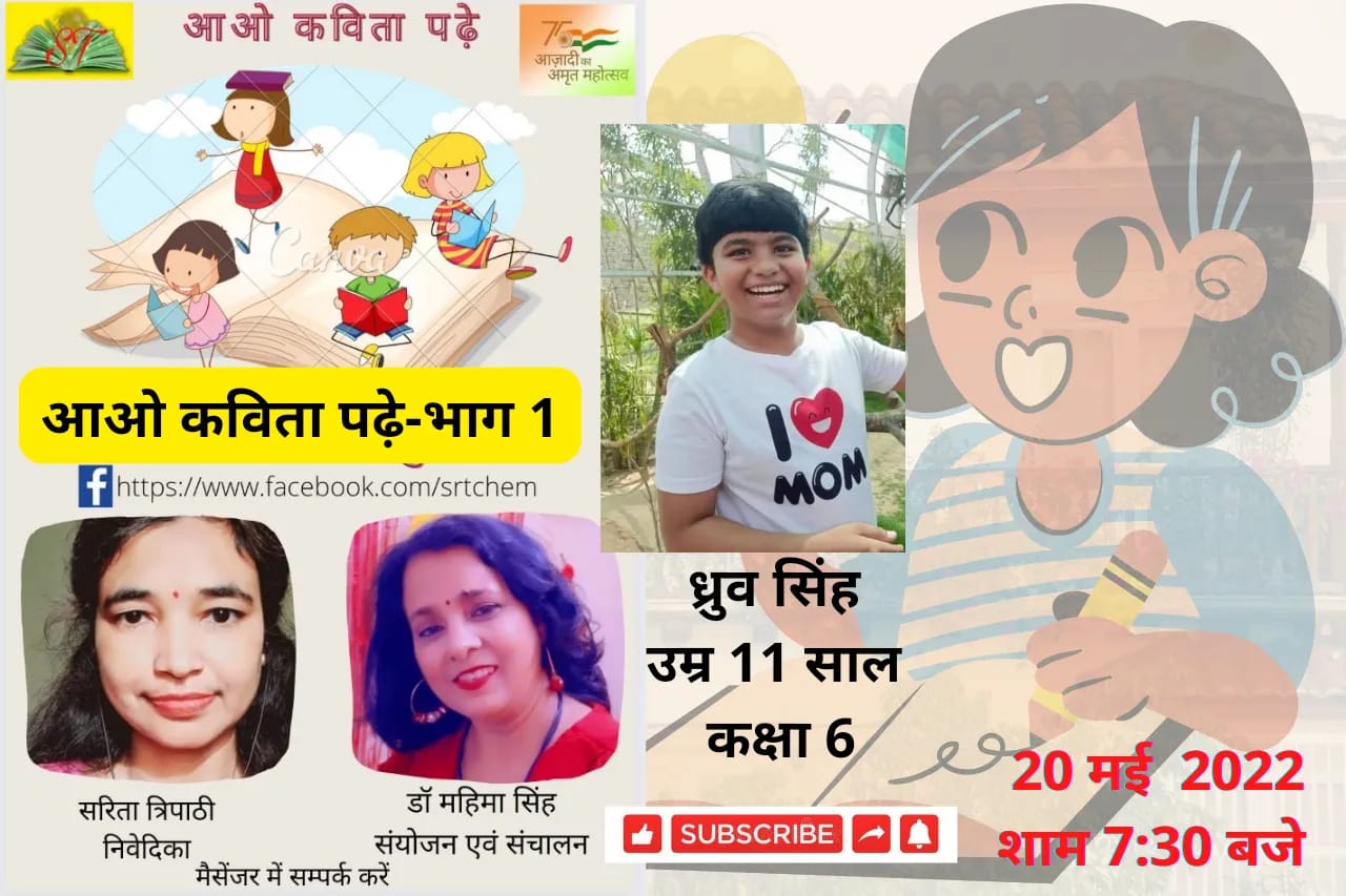 डॉ महिमा सिह एक शिक्षिका भी है। वो बच्चों की हिंदी की कक्षाएं भी संचालित करती है । इसी दौरान उन्होंने महसूस किया की आज कल के पाठ्यक्रम मे कविताओ का स्तर कुछ अजीब और स्तरहीन सा है फलस्वरूप मन मे विचार आया कि क्यू न कुछ ऐसा किया जाए जिससे बच्चों में हिंदी साहित्य के प्रति रुचि जगाई जाए और उन्हें काव्य जगत से जोड़ा जा सके और उनकी रुचि कविता पाठन और लेखन में बढ़ायी जा सके। परिणामस्वरूप उन्होंने लखनऊ की सरिता त्रिपाठी के पटल पर यह कार्यक्रम करने का प्रस्ताव रखा वो सहर्ष तैयार हो गयी और परिणाम आपके समक्ष है। आओ कविता पढ़े भाग – 1 में हमारे पहले नन्हे मेहमान कलाकार बने ध्रुव सिंह जो कक्षा-6 के विद्यार्थी है और चंडीगढ़ के रहने वाले हैं। उनकी माता डा० मंजू भी एक कवियत्री है।