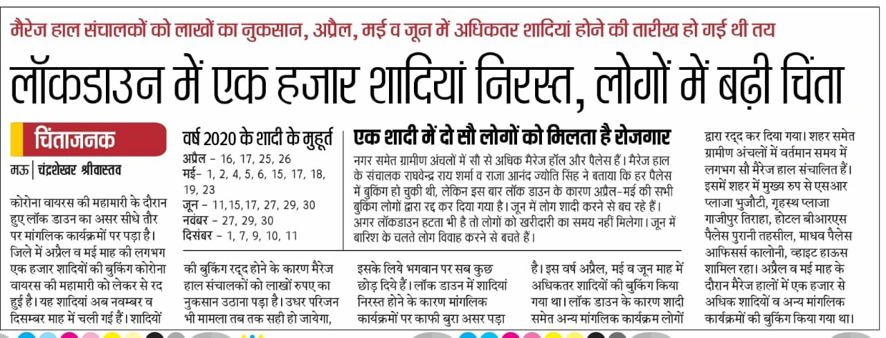 मऊ। नगर समेत ग्रामीण अंचलों में सौ से अधिक मैरेज हॉल और पैलेस हैं। मैरेज हाल के संचालक राघवेन्द्र राय शर्मा व राजा आनंद ज्योति सिंह ने बताया कि हर पैलेस में बुकिंग हो चुकी थी, लेकिन इस बार लॉक डाउन के कारण अप्रैल-मई की सभी बुकिंग लोगों द्वारा रद्द कर दिया गया है। जून में लोग शादी करने से बच रहे हैं। अगर लॉकडाउन हटता भी है तो लोगों को खरीदारी का समय नहीं मिलेगा। जून में बारिश के चलते लोग विवाह करने से बचते हैं। एक शादी से 200 लोगों को रोजगार मिलता है। ऐसे में ये लोग भी प्रभावित हो रहे हैं। कई लोगों ने एडवांस राशि वापस ले ली है तो कई लोग अगले मुहूर्त के लिए एडवांस को संचालकों के पास ही सुरक्षित रखे हुए हैं।