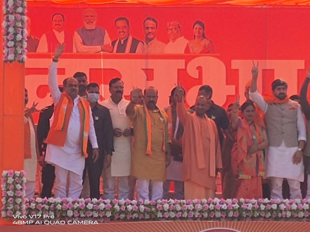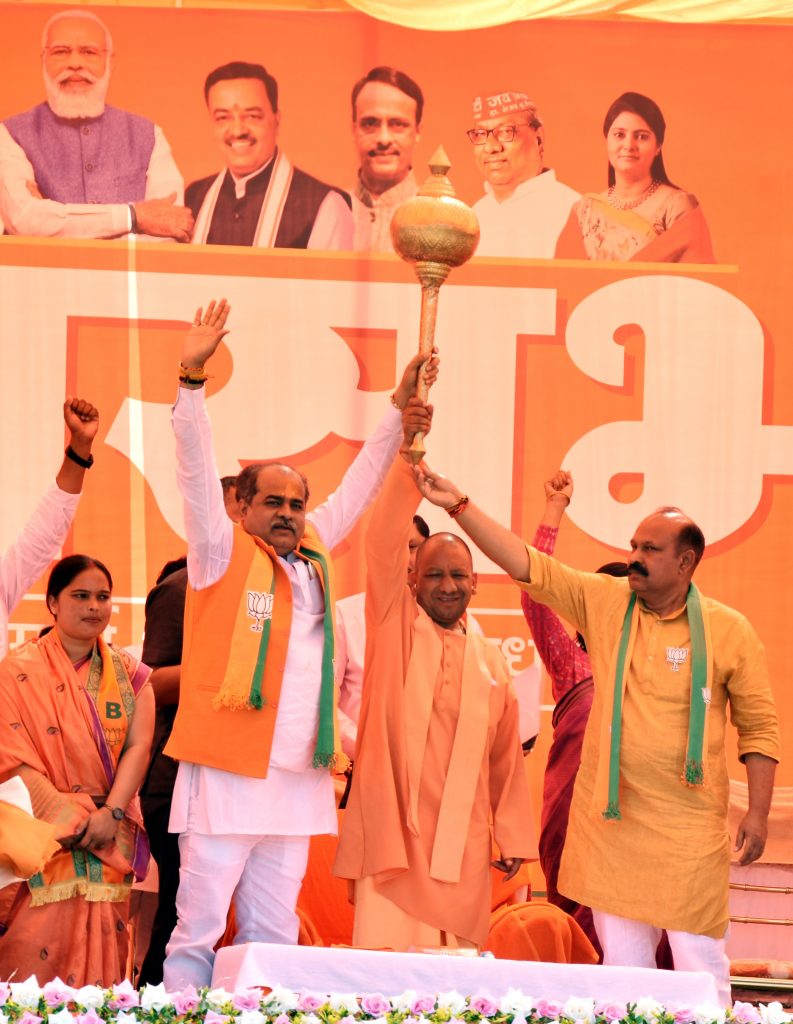 कार्यक्रम के दौरान भारतीय जनता पार्टी के सदर विधानसभा के प्रत्याशी अशोक कुमार सिंह और जिला पंचायत के अध्यक्ष मनोज राय ने मुख्यमंत्री को गदा भेंटकर उनका स्वागत और सम्मान किया। दौरान मंच पर भाजपा के क्षेत्रीय अध्यक्ष धर्मेंद्र सिंह, पूर्व सांसद हरिनरायन राजभर, एमएलसी यशवंत सिंह, मऊ जनपद के प्रभारी सहजानंद राय, लखनऊ विश्वविद्यालय के छात्र संघ के पूर्व अध्यक्ष बजरंगी सिंह बज्जू, युवा नेता शक्ति सिंह, श्रीमती मंजू सिंह, हिन्दू युवा वाहिनी के जिलाध्यक्ष अजय सिंह, भाजपा जिलाध्यक्ष प्रवीण गुप्ता, पूर्व राज्यमंत्री अजय कुमार, त्रिवेणी सर्राफ, अखिलेश राजभर, अखिलेश तिवारी, संजीव जायसवाल डिंपल, श्रीमती नूपुर अग्रवाल आदि मौजूद रहे।