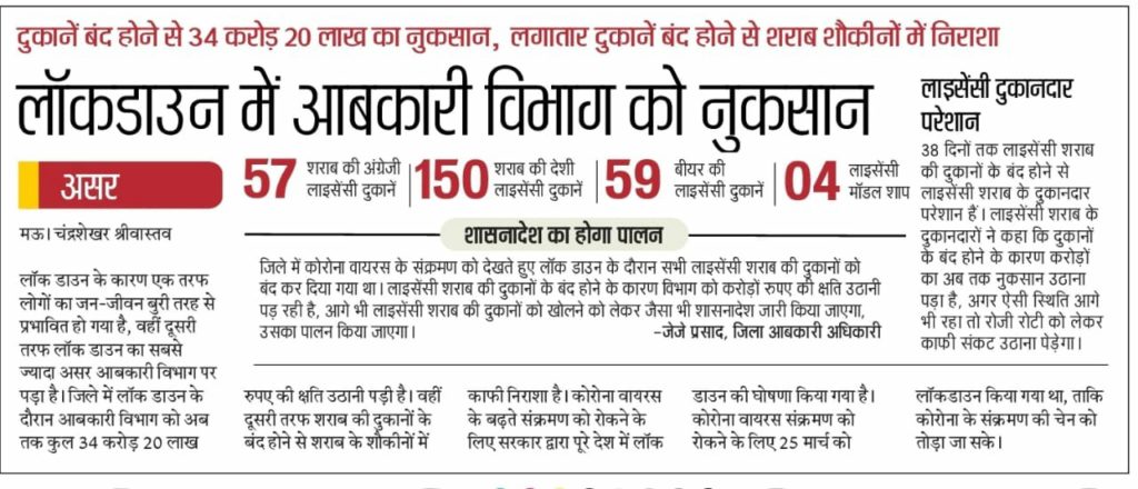 मऊ। लॉक डाउन के कारण एक तरफ लोगों का जन-जीवन बुरी तरह से प्रभावित हो गया है, वहीं दूसरी तरफ लॉक डाउन का सबसे ज्यादा असर आबकारी विभाग पर पड़ा है। जिले में लॉक डाउन के दौरान आबकारी विभाग को अब तक कुल 34 करोड़ 20 लाख रुपए की क्षति उठानी पड़ी है। वहीं दूसरी तरफ शराब की दुकानों के बंद होने से शराब के शौकीनों में काफी निराशा है।