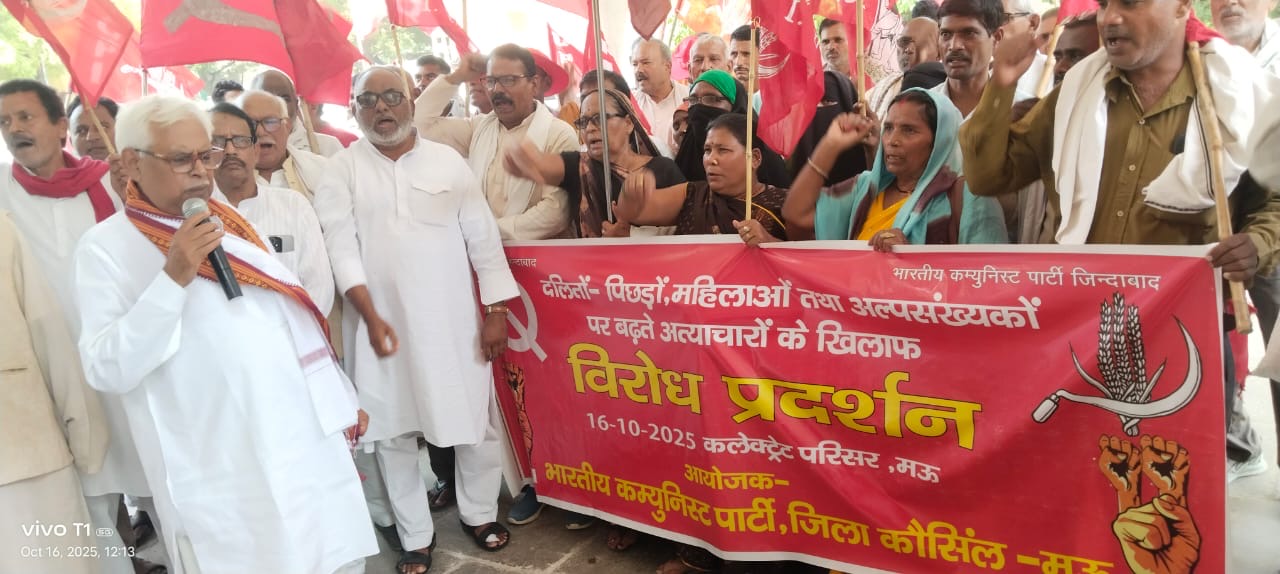 मऊ। भारतीय कम्युनिस्ट पार्टी (भाकपा) के राज्यव्यापी आह्वान पर गुरुवार को मऊ कलेक्ट्रेट परिसर में सैकड़ों कार्यकर्ताओं ने ज़ोरदार प्रदर्शन कर समाज के हाशिए पर खड़े समुदायों के खिलाफ हो रहे अत्याचारों के खिलाफ आवाज़ बुलंद की। प्रदर्शन का मुख्य केंद्र बिंदु दलितों, पिछड़ों, महिलाओं और धार्मिक अल्पसंख्यकों पर बढ़ती घृणा हिंसा, भेदभाव और शासन-प्रशासन की निष्क्रियता रही।