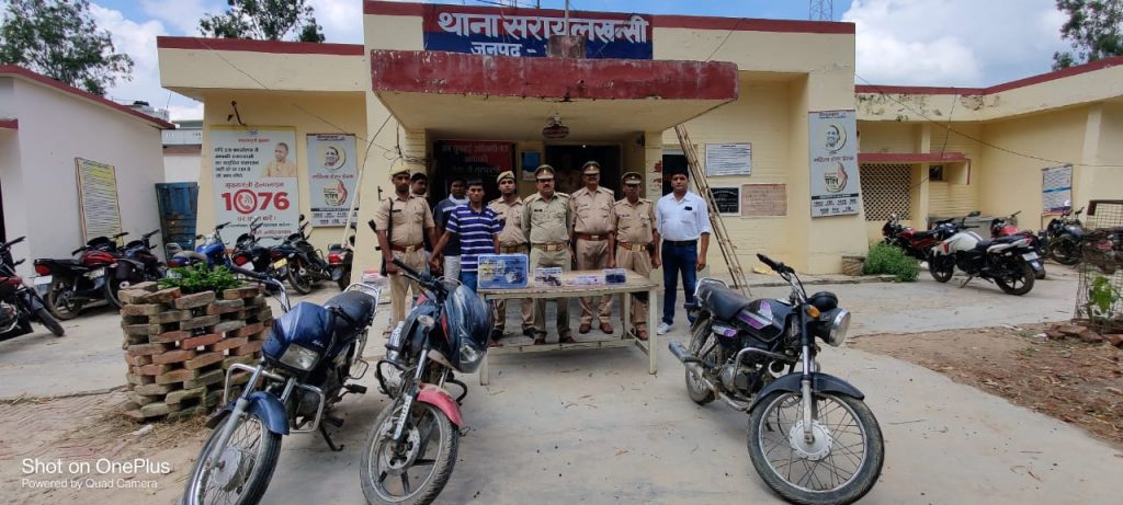 मऊ। पुलिस अधीक्षक मऊ सुशील घुले के निर्देशन में अपराध/अपराधियों के विरुद्ध चलाये जा रहे अभियान के क्रम में थाना सरायलखंसी पुलिस को उस समय अहम सफलता हाथ लगी जब जरिये मुखबिर की सूचना पर दिनांक 06.09.2021 को शायं 19.00 बजे बबुआपुर मोड़ पर चेकिंग के दौरान दो मोटर साइकिल से 04 बदमाशो को रोकने का इशारा किया गया तो गाड़ी छोड़ कर भागने लगे जिसमे एक अभियुक्त को पकड़ लिया गया जिसने अपना नाम – अशोक राजभर पुत्र राम हरी राजभर निवासी ग्राम मिर्जापुर थाना रानीपुर जनपद मऊ बताया। जिसके पास से एक अदद तमन्चा देशी 315 बोर व एक अदद जिन्दा कारतूस 315 बोर एक जोड़ा कान का झूमका पीली धातु, 32080 रु0, तीन अदद मोबाइल तथा उसके निशान देही पर 03 अदद लूट/ चोरी के मोटर साइकिल बरामद हुई अभियुक्त द्वारा लूट/चोरी का कई घटनाओ का खुलासा किया जिसमे यूमियन बैंक मोहम्मदाबाद मऊ के सेल्समैन से हुई लूट के 12080 रु0 तथा थाना मरदह जनपद गाजीपुर मे देशी शराब सेल्समैन से हुई लूट का 20000 रु0 है । तथा लूट की मोटर साइकिल सुपर स्पेलेन्डर और थाना दुल्लहपुर जनपद गाजीपुर से पल्सर लूट कर वाराणसी मे बेचने की बात स्वीकार किया गया।