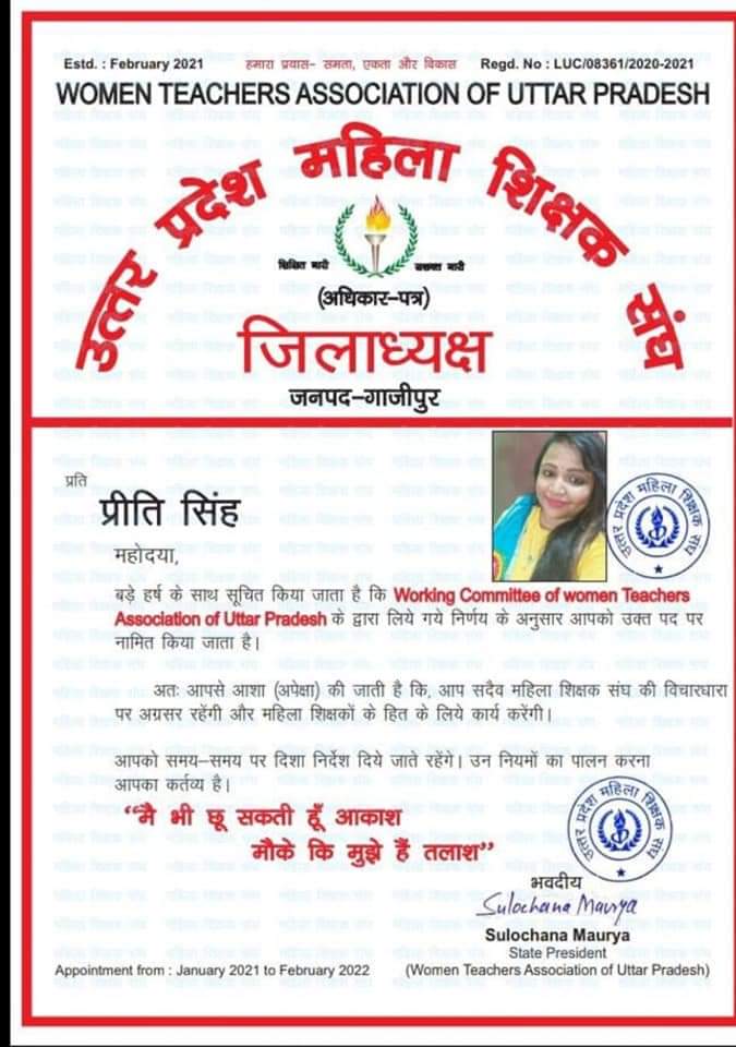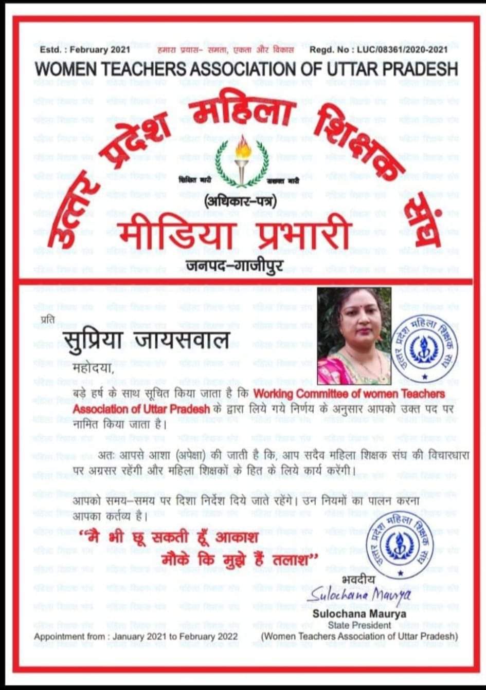 उ. प्र. महिला शिक्षक संघ गाजीपुर की जिलाध्यक्ष प्रीती, महामंत्री शीला व मीडिया प्रभारी बनी सुप्रिया