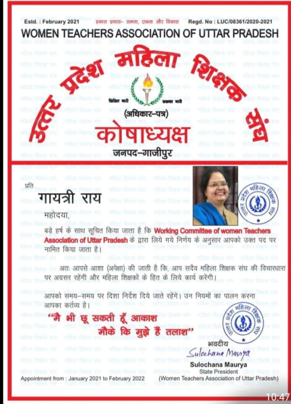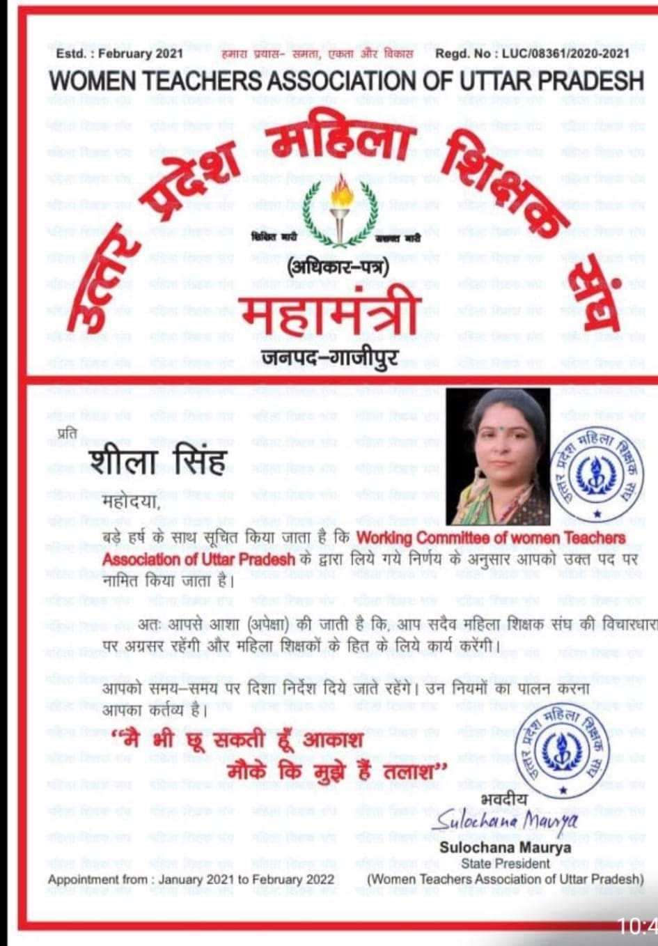 प्रदेश अध्यक्ष सुलोचना मौर्या ने गाजीपुर जनपद की अपनी नवगठित टीम को बधाई देते हुए आशा व्यक्त किया है कि वे शिक्षक हित व संगठन हित में काम करते हुए संगठन को ऊंचाई तक ले जाएंगे।